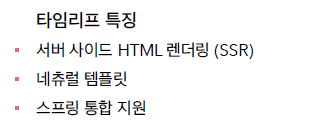 : 타임리프는 백엔드 서버에서 HTML을 동적으로 렌더링 하는 용도로 사용된다. 백엔드 개발자가 리엑트, 뷰 같은 프론트엔드 기술까지 배워서 구사하기에는 현실적으로 힘들다. 따라서 SSR을 할 수 있는 뷰 템플릿을 하나 정도는 익히고 있어야 한다.