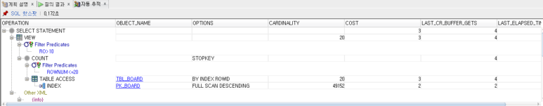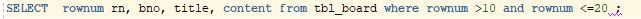 위의 명령은 rownum이 20 이하인 데이터들 즉, 맨 뒤에서 20개의 데이터를 가져와(인덱스를 통해 역순으로 정렬을 하라는 힌트를 주었으므로) rownum을 1부터 20을 배정해주고, 이 중 rownum이 10을 초과하는 것들만 가져오라는 뜻이다.