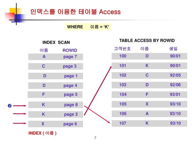 - 인덱스와 실제 테이블은 위와 같이 ROWID 라는 값으로 연결 되어 있다.