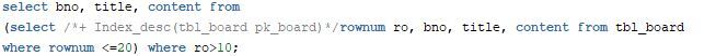 ex) select /*+index_desc (tbl_board pk_board) */ * from tbl_board;