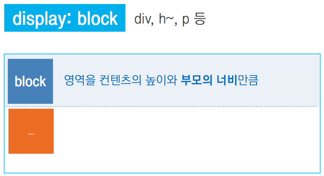 display 속성 값이 블록인 요소는 언제나 새로운 줄(line)로 바뀜. 해당 줄의 모든 너비를 차지함(width: 100%)
